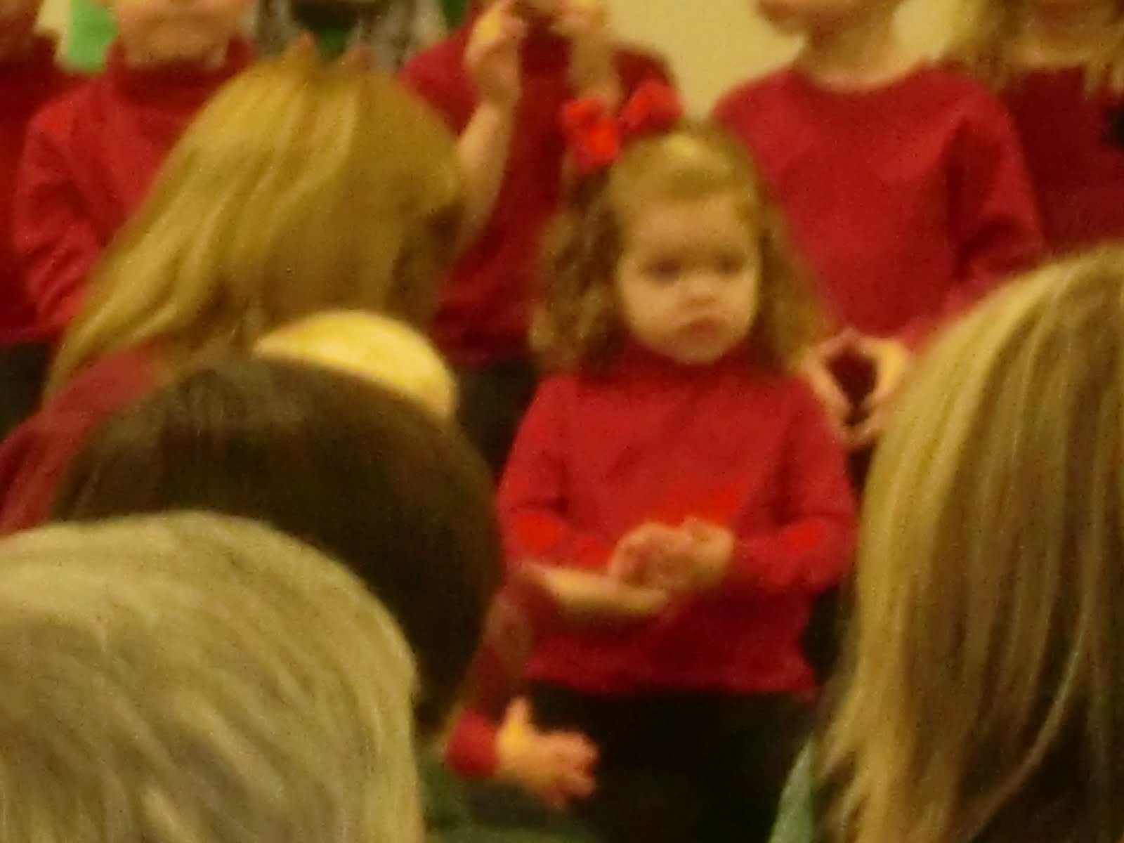 I almost didn’t even post the super blurry picture of Mary Grace, but I had to provide proof that she was indeed there. The video of her, however, was taken at home. It cracks me up how it sounds like she sings “Mary had a baby boo.” She’s so ghetto, yo.